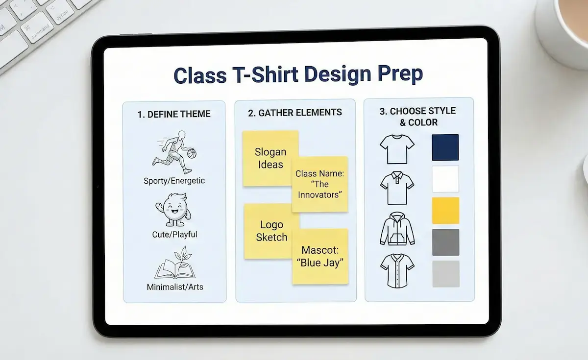 接著,蒐集班級專屬元素,像口號、班級名稱、Logo 或吉祥物,這些都是讓班服更有歸屬感的重要細節。最後,決定服裝款式與配色,無論是清爽T恤、經典POLO衫,還是外套,都能根據用途選擇最合適的設計。只要這三步搞定,後續設計就能更順手!