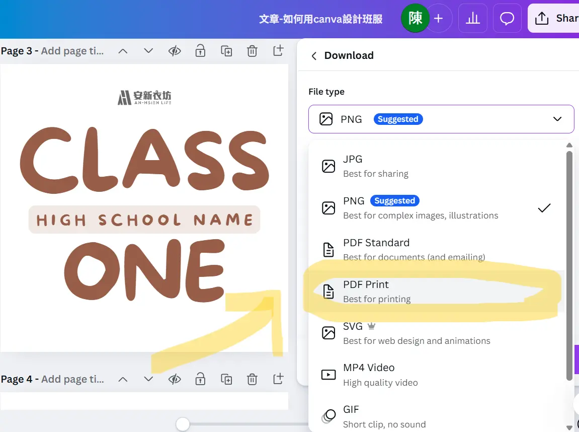 在 Canva 按下「分享Share」>「下載Download」時,你會看到多種選項。對於班服印刷來說,選錯格式就是災難的開始。請參考下表選擇最適合你的班服印刷檔案格式