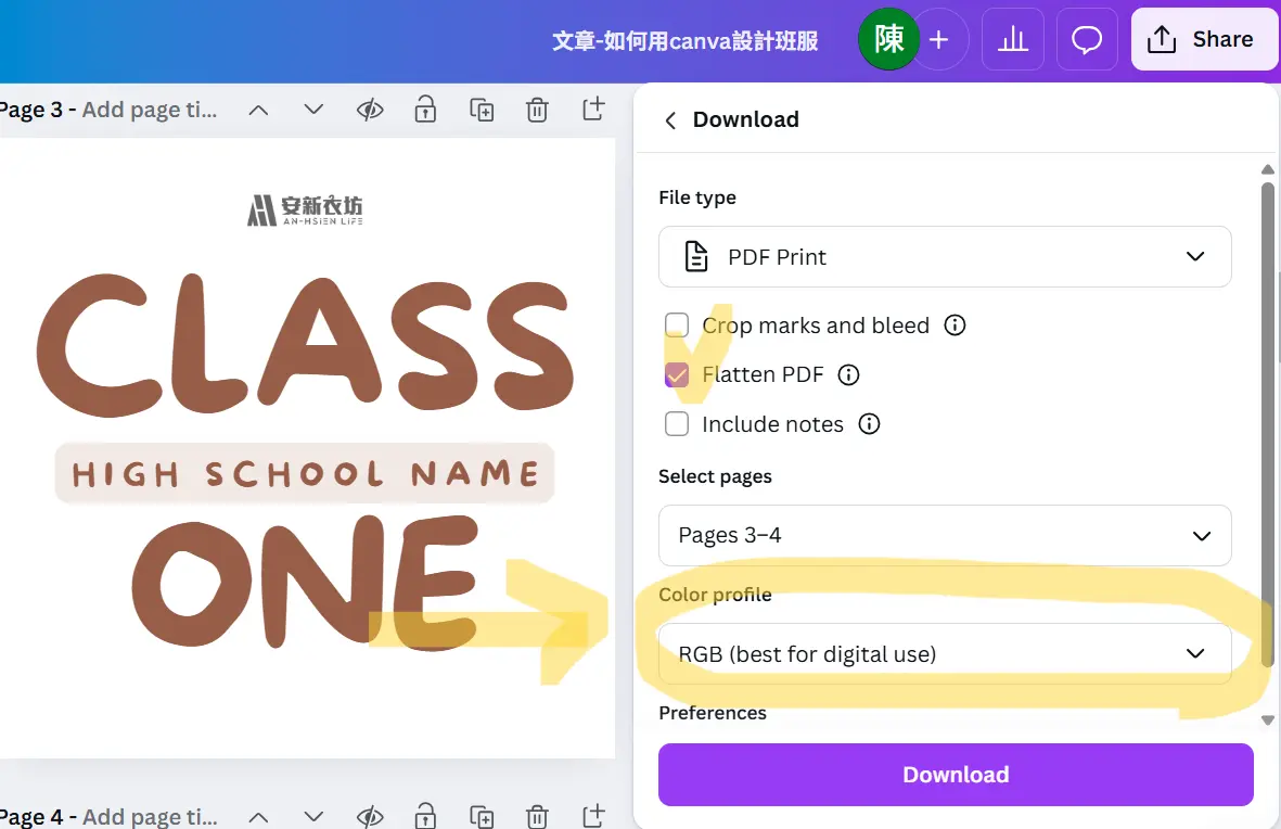 5. 「色彩模式(Color profile)」預設為RGB,在Canva Pro版可選擇CMYK更適合印刷。