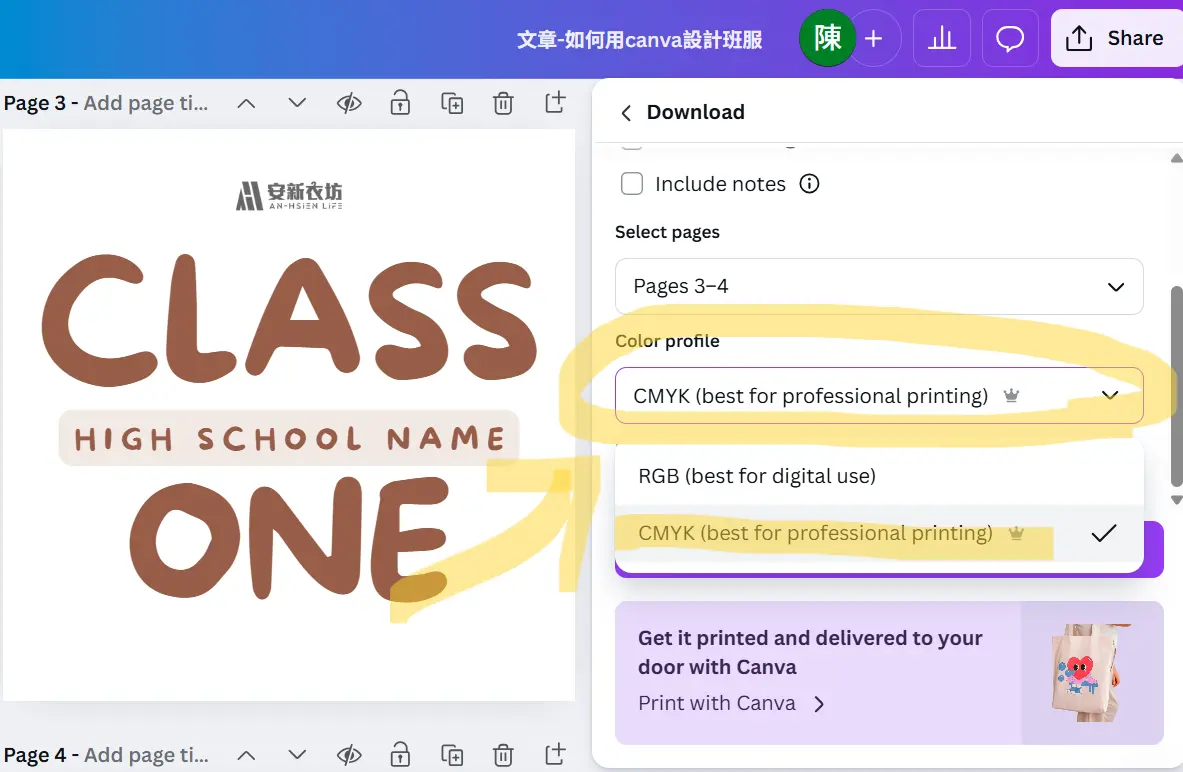 Step5-2.「色彩模式(Color profile)」在Canva Pro版可選CMYK更適合印刷。