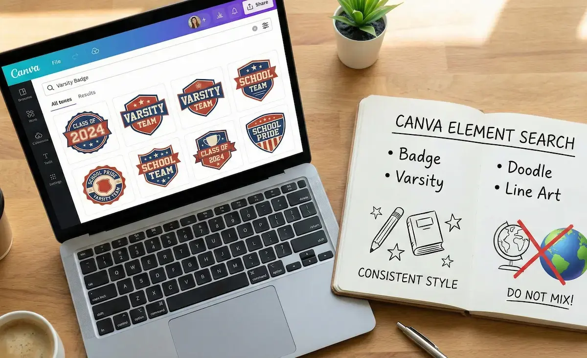 • 關鍵字推薦: 搜尋 「Badge」(徽章)、「Varsity」(美式校園風)、「Doodle」(手繪塗鴉)或 「Line art」(線條藝術)。