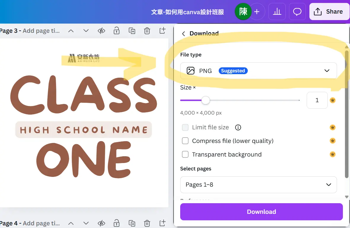 💡操作祕技: 如果你的班服圖案是「不規則形狀」(例如只有一個班徽在胸口),下載時務必勾選 「透明背景 (Transparent Background)」(此為 Canva Pro 功能)。若你是免費用戶,下載後可能需要使用外部工具去除白色底圖,否則印在深色衣服上會出現一塊尷尬的白色方塊。