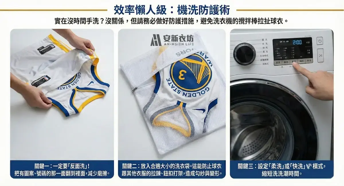 - 關鍵一:一定要「反面洗」! 把有圖案、號碼的那一面翻到裡面,減少磨擦。