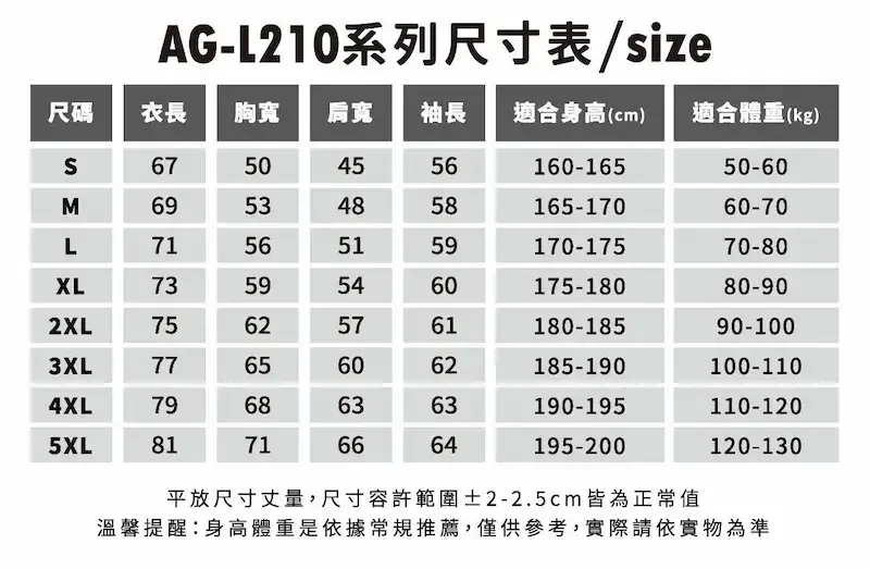 AG-L210 經典重磅長袖T恤:採用 100% 精梳棉與緊密賽絡紡工藝,厚實挺拔、多色可選。圖內附有真人穿著比例與詳細 S-5XL 尺碼表供參考。