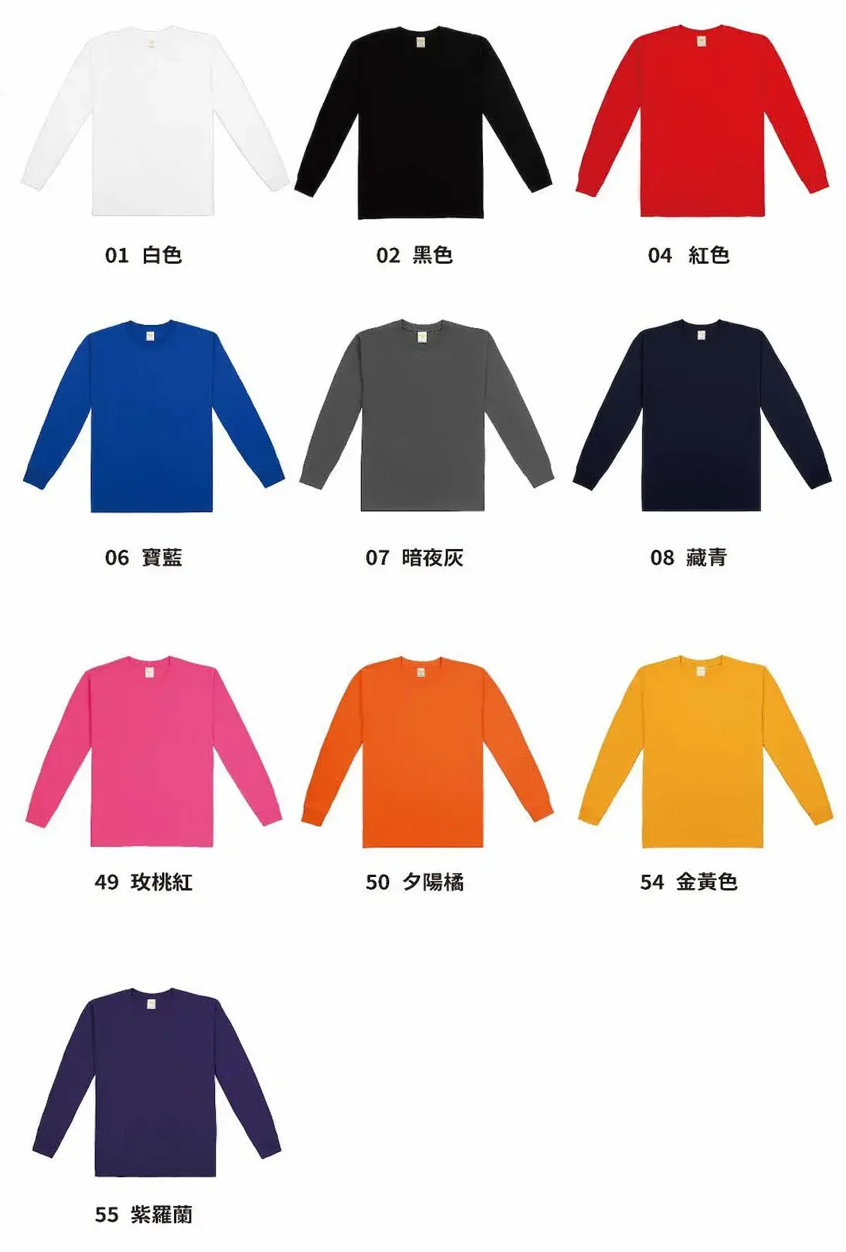Arrive Guide AG_L210 重磅長袖 T 恤 10 色總覽:提供白色、黑色、紅色、寶藍、暗夜灰、藏青、玫桃紅、夕陽橘、金黃色、紫羅蘭等豐富配色。