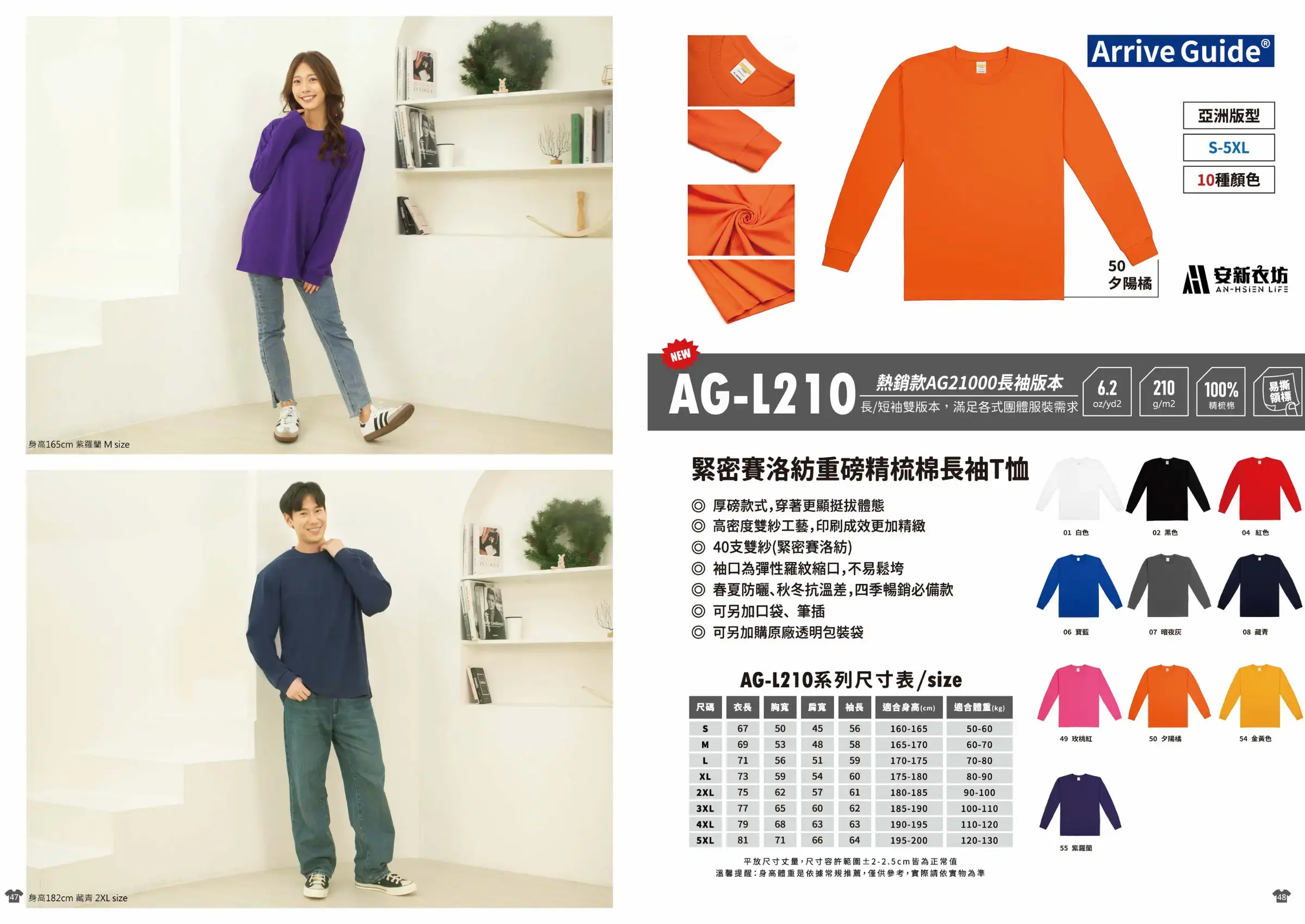 Arrive Guide AG-L210 緊密賽絡紡重磅精梳棉長袖T恤,提供10種顏色與S-5XL尺碼表,適合團體服服裝需求。