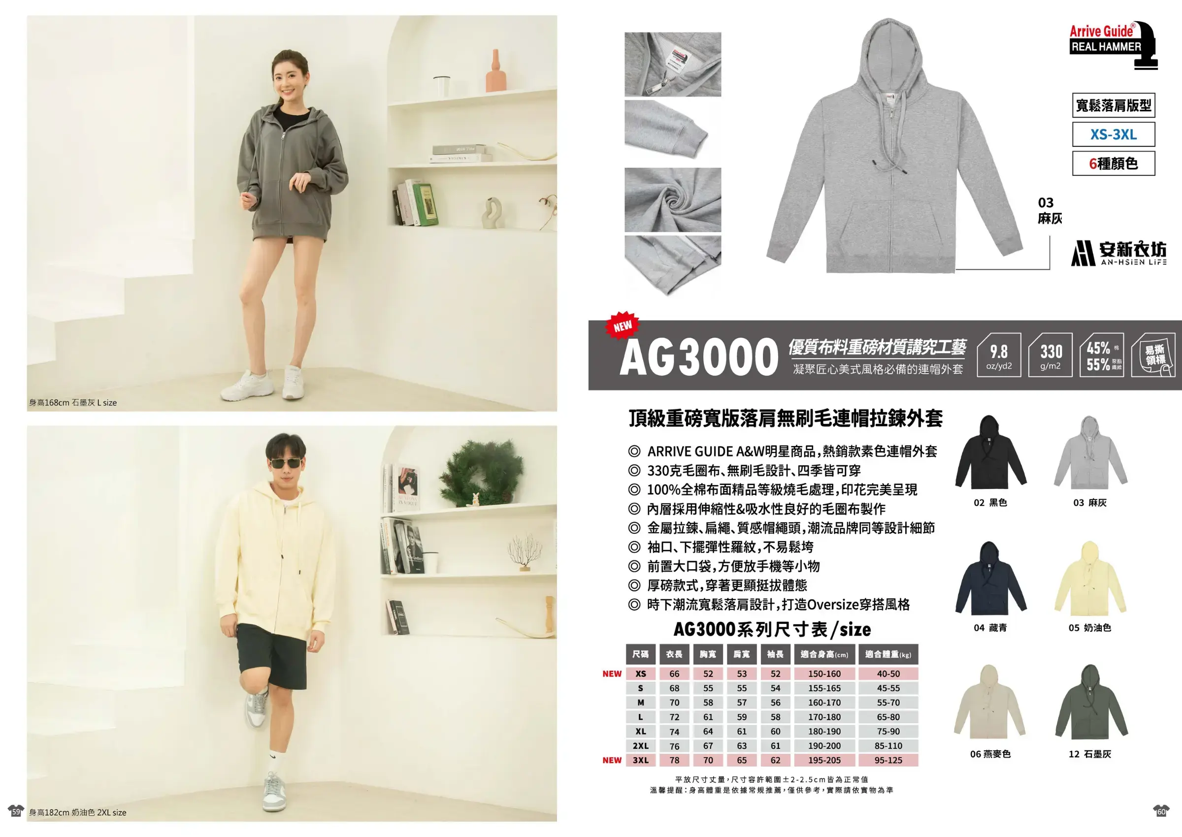 ARRIVE GUIDE 頂級重磅寬版落肩無刷毛連帽拉鍊外套 AG3000,採用330g/m²(9.8 oz/yd²),45%棉 55%聚酯纖維製成,優質布料重磅材質講究工藝,凝聚匠心美式風格必備的連帽外套,ARRIVE GUIDE A&W明星商品,熱銷款素色連帽外套。330克毛圈布、無刷毛設計、四季皆可穿,100%全棉布面精品等級燒毛處理,印花完美呈現,內層採用伸縮性&吸水性良好的毛圈布製作金屬拉鍊、扁繩、質感帽繩頭,潮流品牌同等設計細節。袖口、下擺彈性羅紋,不易鬆垮,前置大口袋,方便放手機等小物,厚磅款式,穿著更顯挺拔體態,時下潮流寬鬆落肩設計,打造Oversize穿搭風格,尺碼齊全XS~3L,因應各式團體服裝需求,色彩豐富6色,變化性高。可另加購口袋、筆插