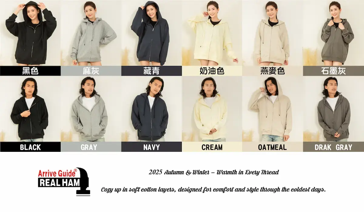 ARRIVE GUIDE 頂級重磅寬版落肩無刷毛連帽拉鍊外套 AG3000,模特展示最火的6種顏色,給您參考。