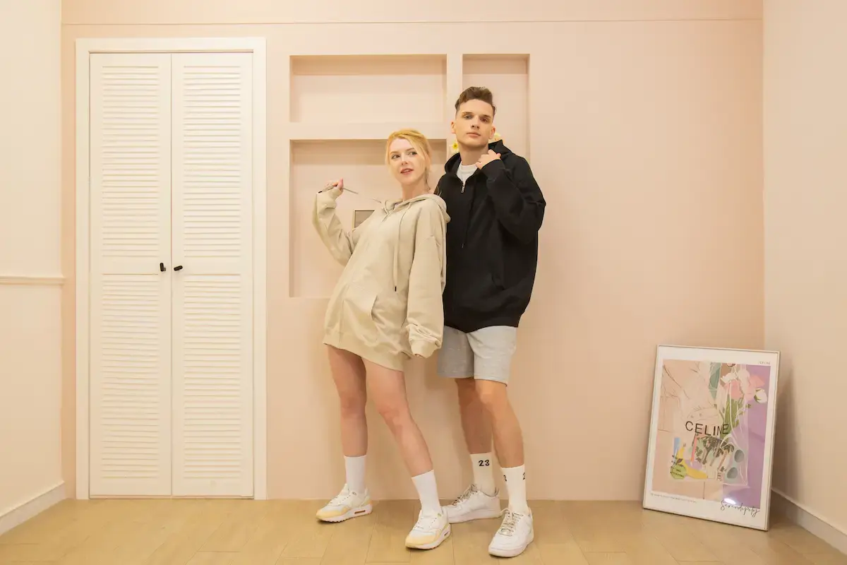 男女模特兒情境實穿 ARRIVE GUIDE AG3000 重磅連帽拉鍊外套,女性模特兒穿著燕麥色 (Oatmeal),男性模特兒穿著黑色 (Black),展現寬鬆休閒的美式情侶穿搭風格。