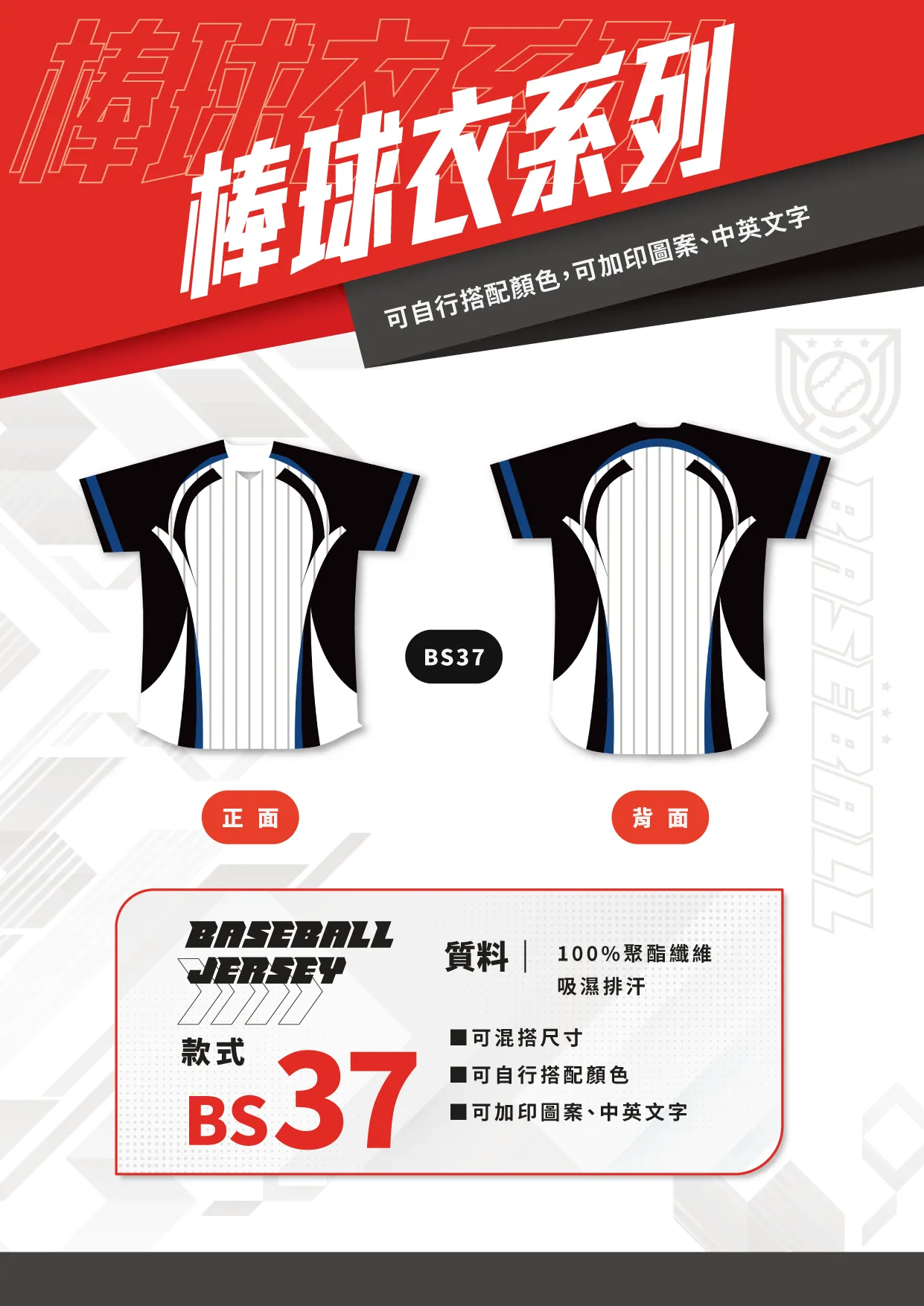棒壘球衣款式BS37,共9款顏色供您挑選。若有其他喜歡的顏色,請提供PANTONE色票或CMYK數值給官方LINE,可以為您調整衣服顏色。