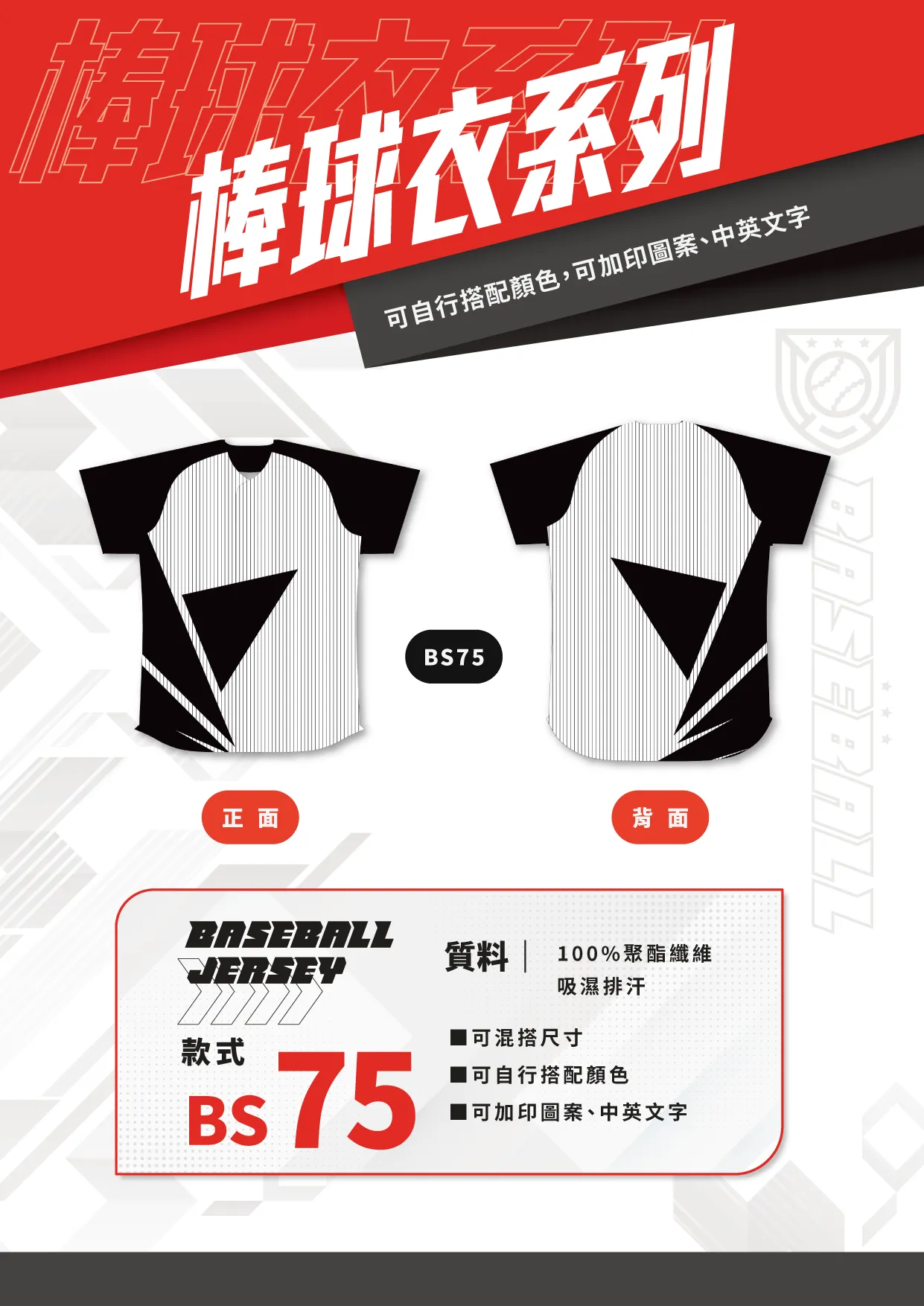 棒壘球衣款式BS75,共9款顏色供您挑選。若有其他喜歡的顏色,請提供PANTONE色票或CMYK數值給官方LINE,可以為您調整衣服顏色。