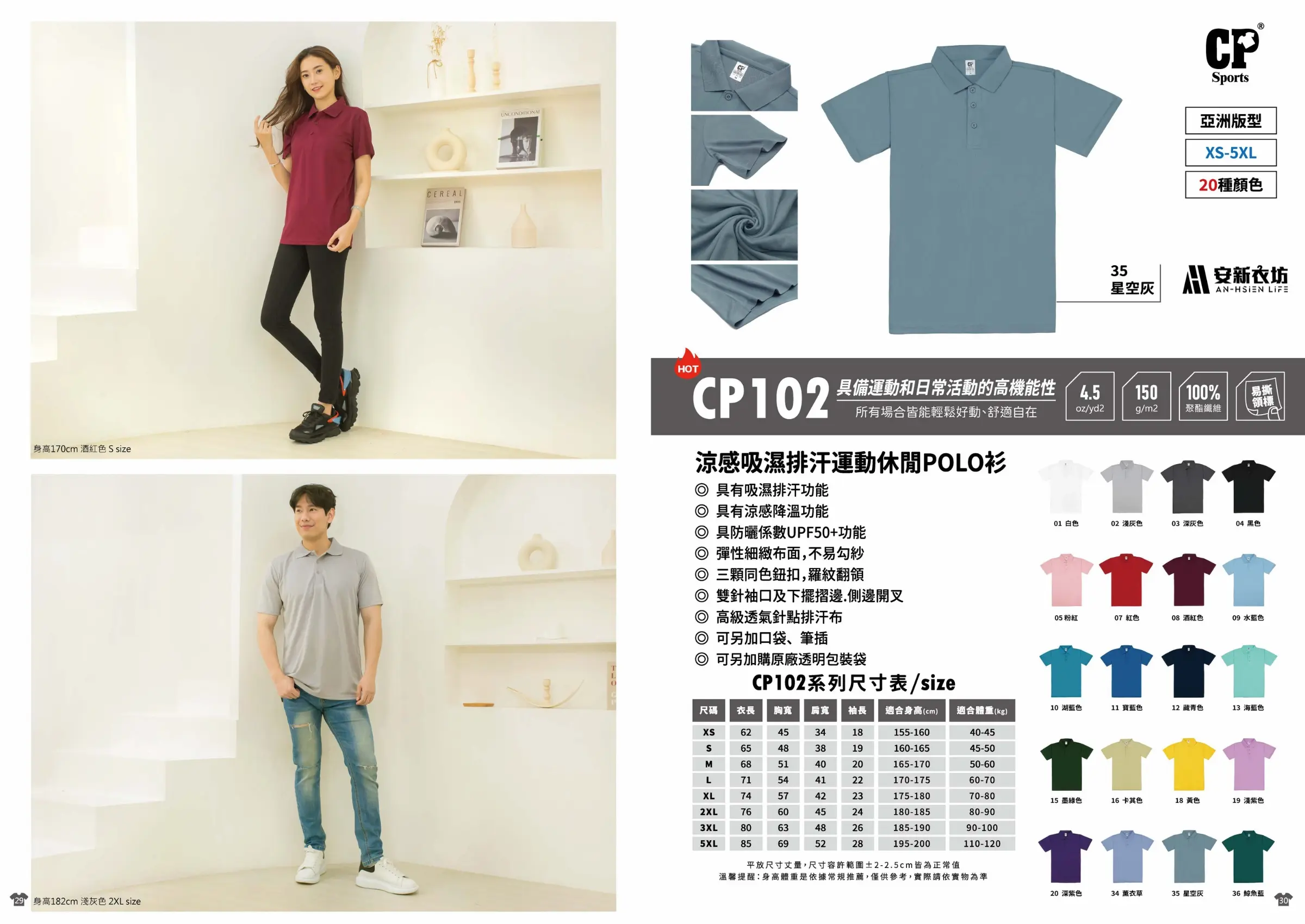 CP Sports 涼感吸濕排汗休閒POLO衫 CP102,採用4.5 oz/yd²,150g/m²,100%聚酯纖維,高級透氣針點排汗布。運動和日常活動的高機能性,所有場合皆能輕鬆好動、舒適自在,具有吸濕排汗功能、涼感降溫功能,防曬係數UPF50+。彈性纖維,不易勾紗,三顆同色鈕扣,羅紋翻領,雙針袖口及下擺擱邊,側邊開叉。可另加口袋、筆插。易撕領標、印刷加工推薦款。